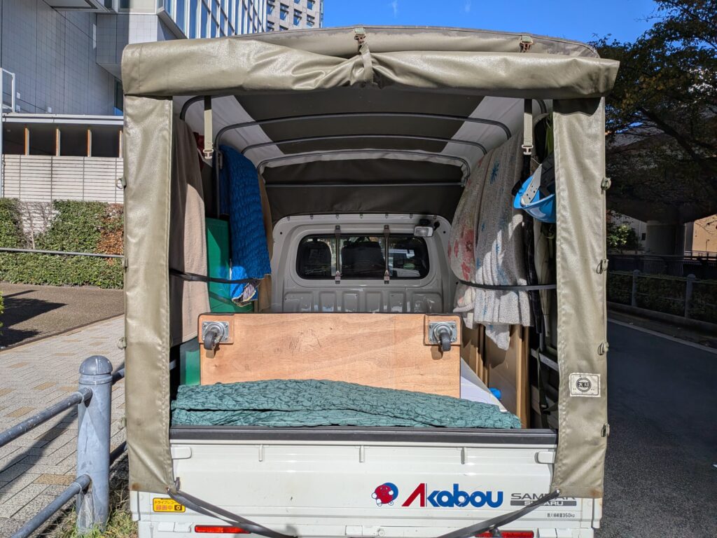 今回の積込み場所は東京都千代田区。夕方は車の出入りが多くなる時間帯でしたので、トラックの横付け時間を短くできるよう、あらかじめ荷台に毛布・マット・固定具をセットした状態で伺いました。